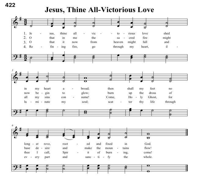 “Jesus, Thine All Victorious Love” is a common meter text (8.6.8.6.) and could be sung to a great many tunes. It is often paired with Lowell Mason’s version of AZMON, which is ideal for most stanzas of the text. The iambic structure of the hymn aligns well with the fact that AZMON begins with a pickup note. However, because two lines of the stanza “Jesus, thine all victorious love” begin with a stressed syllable (“Je-sus” and “root-ed”), using AZMON, which has both a pickup and fast note values on the downbeat of each measure, could be awkward. One might consider singing the hymn to a common meter tune that begins without a pickup, such as ST. AGNES. Regardless of the tune chosen, though, or the number of stanzas one endeavors to sing, “Jesus, Thine All Victorious Love” is an exemplary Wesleyan hymn. Consider it the next time you sing during Eastertide.