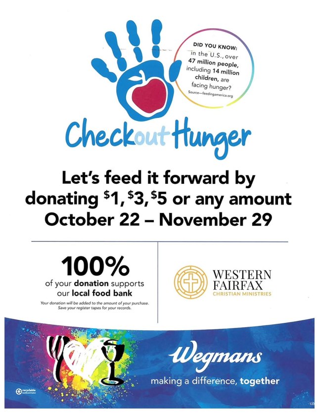 Did you know that anytime you shop at Wegmans thru November 29, you can participate in “Checkout Hunger” and your donations at checkout will benefit WFCM and the families we serve.