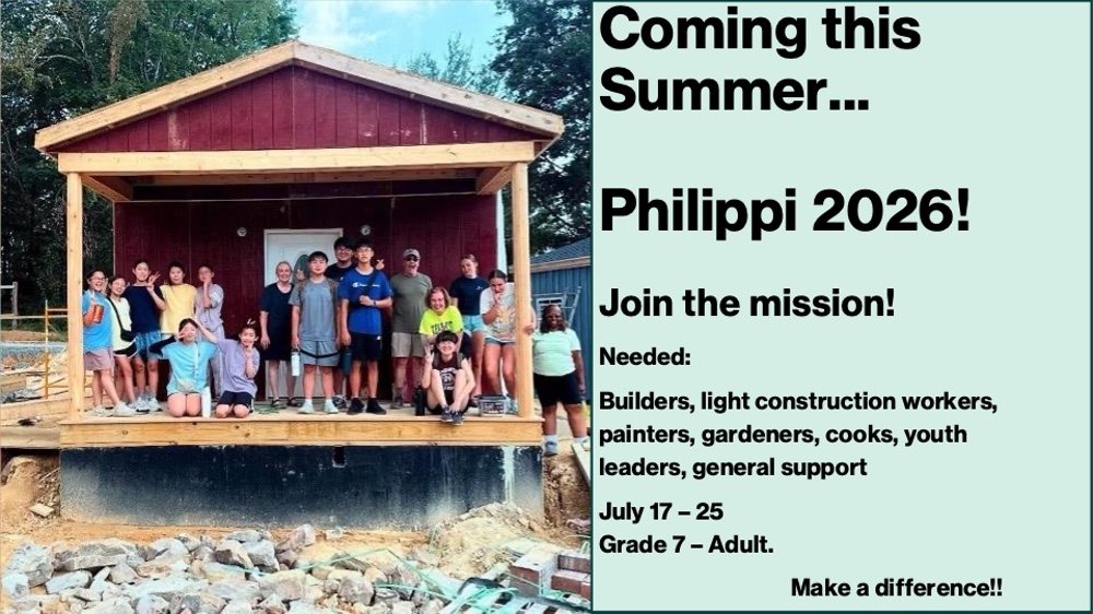 This is a week-long hands-on mission trip for middle to high school teenagers that introduces the youth to spreading the gospel of Jesus Christ through missional living, confronting issues of social justice, and completion of a hands-on project in Philippi, West Virginia.
