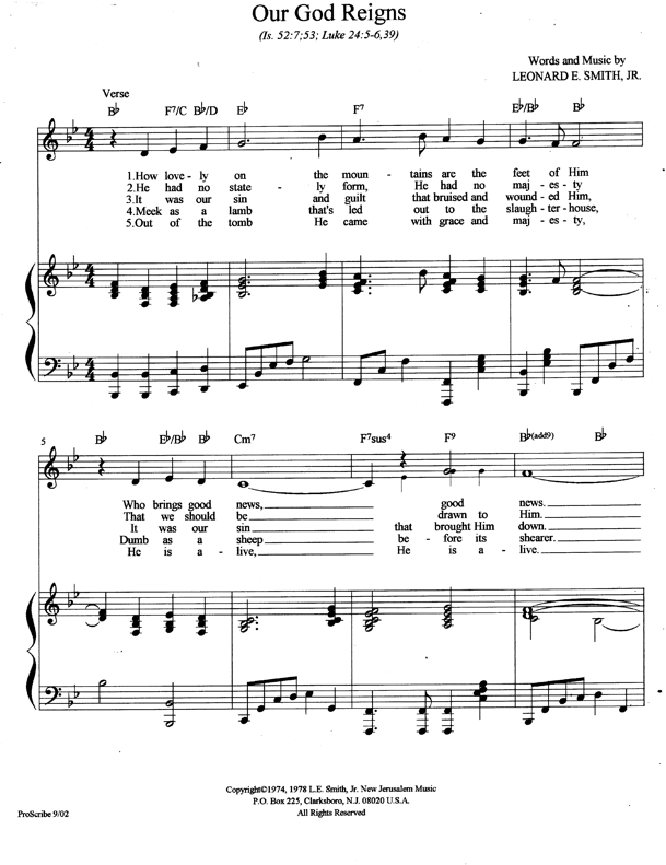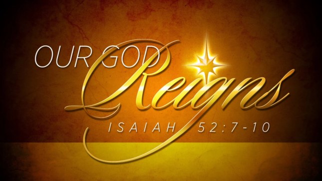 Isaiah 52:7 speaks of “good news,” originally referring to Israel’s delivery from captivity and return to Jerusalem. Today, Christians sing these words to celebrate our delivery from sin through Christ (Romans 10:15-16), who brings salvation and a restoration of God’s rule, resulting in peace and happiness. The song text skillfully combines Isaiah’s message with the timeless theme from the Psalms: Our God reigns!